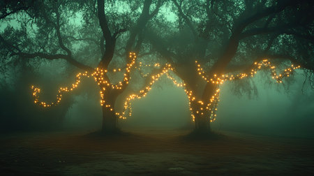 Mystical scene featuring two trees wrapped in glowing lights, surrounded by a dense fog that creates an enchanting atmosphere at dusk.