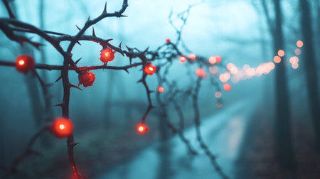A dark, spiky vine is intricately wrapped with a garland of small, luminous red lights. Some bulbs are shaped like delicate, glowing rosebuds, creating a warm, magical effect.
