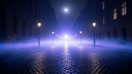 A wet cobblestone street is shrouded in thick blue fog at night, with glowing streetlights creating an atmospheric...