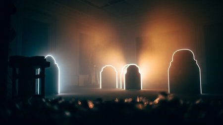 A captivating scene of mysterious figures in shadow, surrounded by a fog that creates an ethereal light effect. The atmosphere evokes intrigue and emotion.