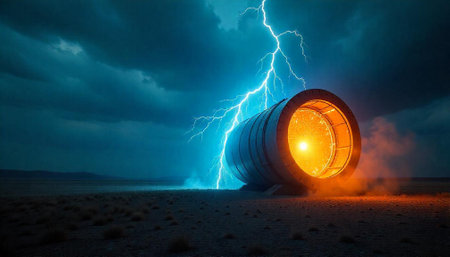 Intense purple lightning strikes across a dark industrial area, showcasing stunning energy and power.