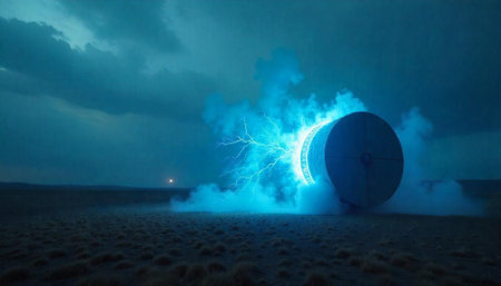 Man in lab coat and goggles works with glowing electrical sparks on a table