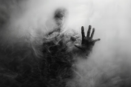 Halloween background. Silhouette of a scary zombie hand in the fog. Black and white photo.