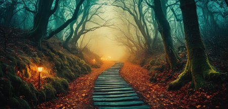 Mysterious autumn forest with fog and path. Halloween concept.