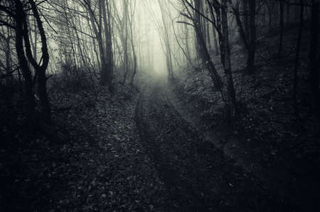 Path through in dark forest with fog and spooky trees