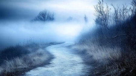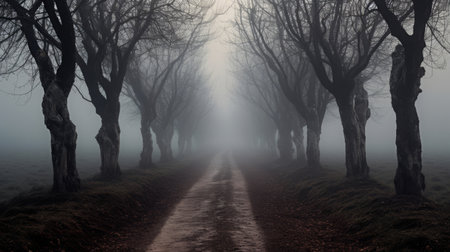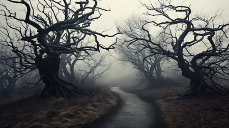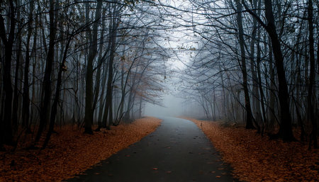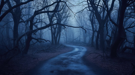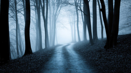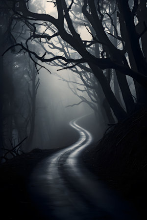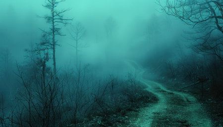 A winding road disappears into a dense, foggy forest, creating a sense of mystery and intrigue. The stark silhouettes of bare trees add a chilling beauty, perfect for evoking a sense of adventure or suspense. Ideal for book covers, websites, or creative projects.
