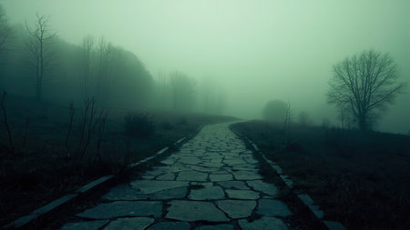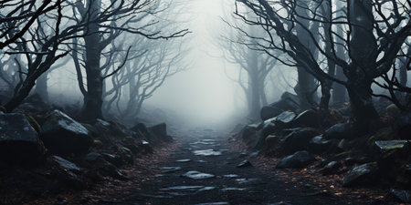 Explore a mysterious and eerie scene with this evocative image of a stone path winding through a misty forest. Bare trees create a spooky silhouette against the overcast sky, enhancing the moody and atmospheric quality. The landscape evokes a sense of tranquility and calm, perfect for conveying themes of journey, destination, and the beauty of nature. This scenic image is ideal for projects seeking to capture a dreamlike or surreal quality in their visual storytelling, related to autumn or cold seasons.