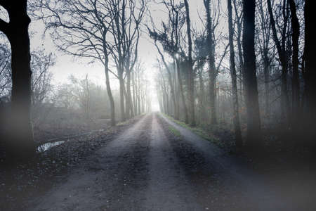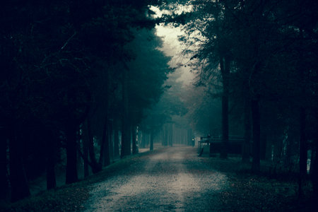 Mysterious dark forest road in the fog. Halloween concept.
