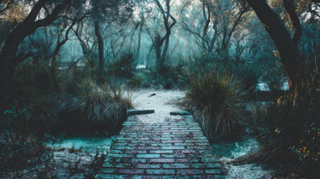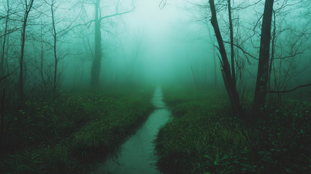 Mystical pathway through foggy swamp at dawn