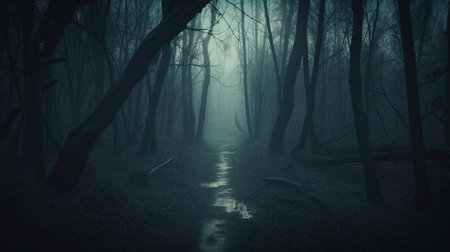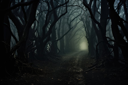 A dark and eerie scene of a mystical scary forest