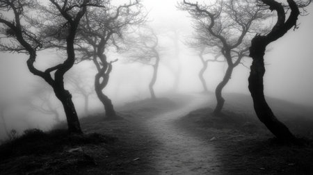 Navigate an eerie pathway through a dense, foggy forest in this evocative landscape. A thick mist cloaks the trees and ground, creating a monochromatic and moody scene. The path leads into the unknown, evoking feelings of solitude and mystery. This atmospheric image is perfect for illustrating concepts of exploration, adventure, or desolation. It's ideal for editorial content, book covers, or any project seeking a spooky, eerie, or surreal aesthetic.