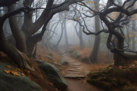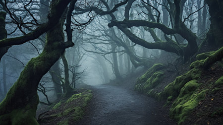 Mysterious foggy woodland path with twisted trees