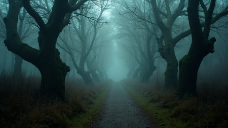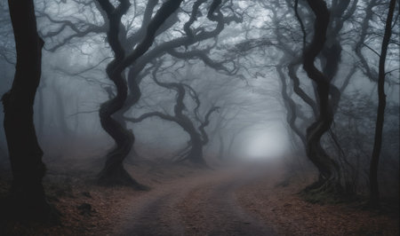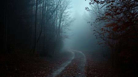 Mysterious Foggy Forest Pathway Enchanting Journey Through Gloomy Woodlands into the Unknown Realms