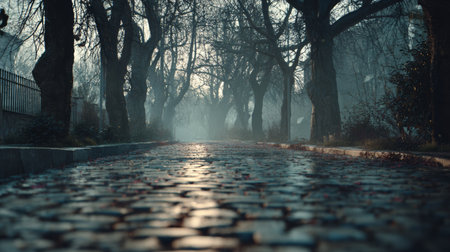 Foggy cobblestone street with bare trees on both sides creating mysterious and eerie atmosphere in early morning light