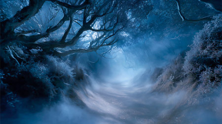 Trees forming a natural tunnel along a path, leading towards an ethereal white light emerging through dense fog, creating a mysterious and atmospheric winter scene with dark blue tones