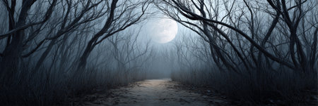 Dirt path winding through a dark, foggy forest with bare, twisted trees under a glowing full moon, evoking mystery, halloween, and an eerie, atmospheric landscape