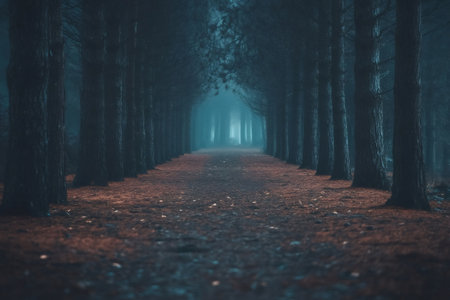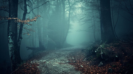Enigmatic shadowy woods with a foggy path on a spooky Halloween night.
