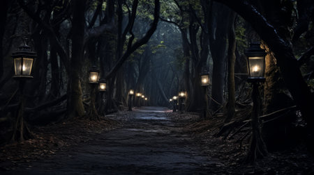 Dark forest path illuminated only by eerie lanterns