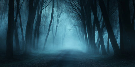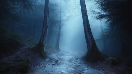 A serene and misty forest pathway invites exploration through a tranquil blue atmosphere. Dark trees loom closely, creating a moody landscape ideal for reflection.