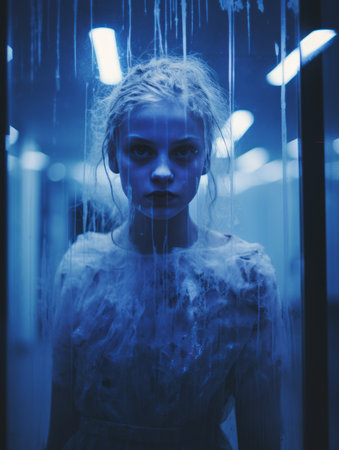 scary portrait of a ghost girl in a white shirt with a blur
