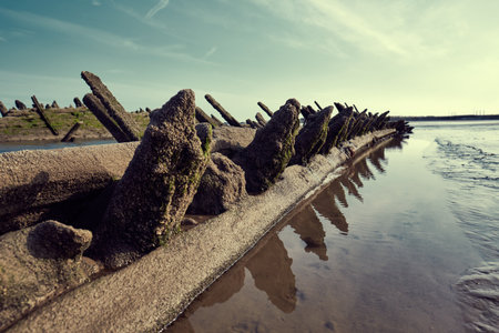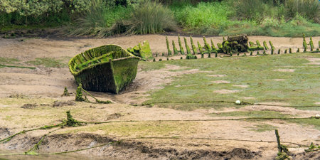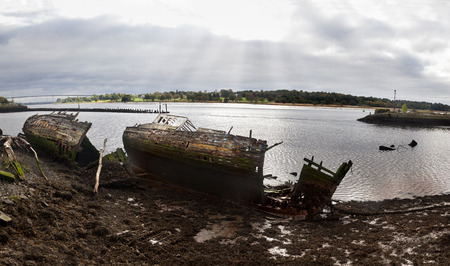 boat wrecks lie rotting away on the marshes of the river Wyre estuary