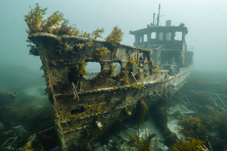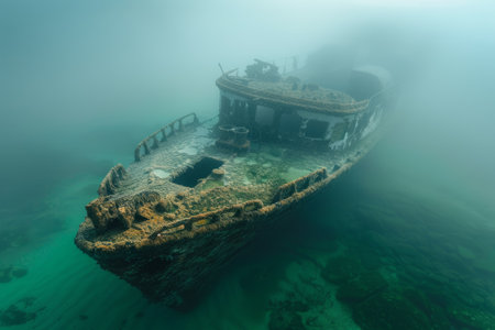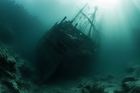 Discover the haunting beauty of a sunken shipwreck, illuminated by soft underwater light. This photo captures the eerie tranquility and historical intrigue of marine exploration.