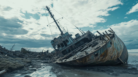 Abandoned rusty shipwreck on misty shore, atmospheric scene. Exploration and decay concept