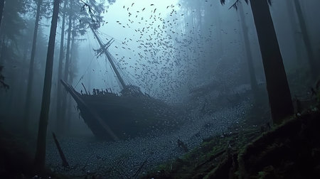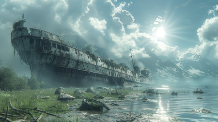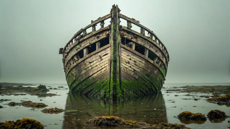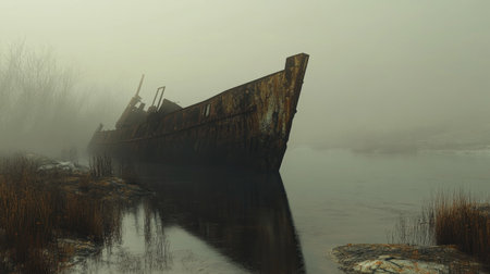 Eerie and mysterious scene featuring an abandoned ship partially submerged in foggy waters. The tranquil atmosphere creates a sense of isolation and intrigue.