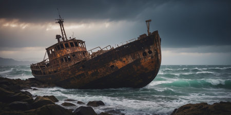 The image depicts an old, rusting shipwreck stranded on a beach, surrounded by stormy weather and ominous dark clouds, illustrating the passage of time and nature's reclamation of man-made objects. AI generated image