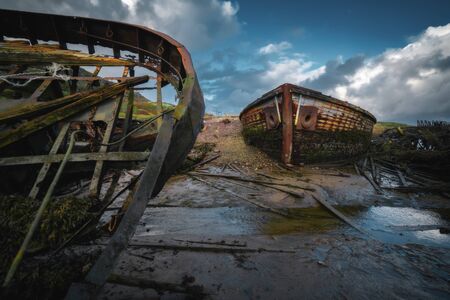The wreckage of old ships off the coast of the Barents Sea. Wrecked, abandoned by the fleet. Russia, Teriberka village, August 2017