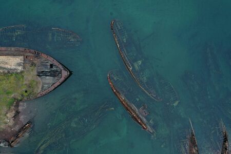 Ship graveyard in Teriberka, Kola Peninsula, Russia. Aerial view.