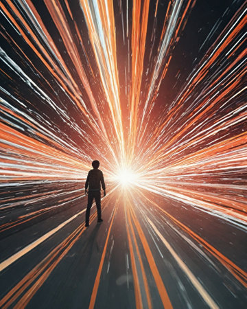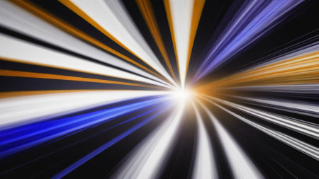 An abstract illustration displays vibrant energy waves extending outwards. The artwork showcases flowing lines in diverse colors, emitting from a central bright point. The composition uses dynamic forms with blurred bokeh effects. It is well-suited for various commercial and editorial applications, offering a dynamic visual element.