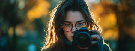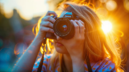 A female photographer captures a glowing sunset with her camera, framed by warm, golden sunlight and creative lens flare.