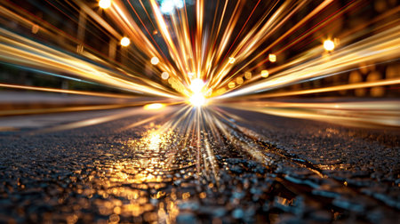 Vibrant display of light trails emanating from central point, creating dynamic sense of motion wet street surface. scene captures energy of urban life night, with glowing streetlights enhancing