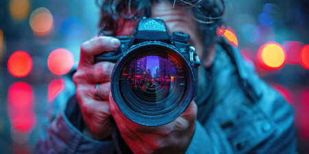 A photographer captures a vibrant urban scene through their camera lens. The reflection highlights the artistry and technique involved in photography.