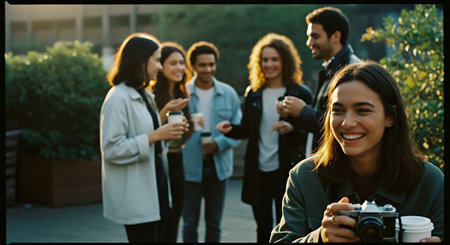 A woman uses her camera to capture a group of people at an event, The influence of influencer marketing in driving brand engagement, AI Generated