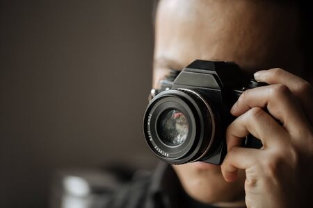 Male photographer taking photos in the city with a blurred background. High quality photo