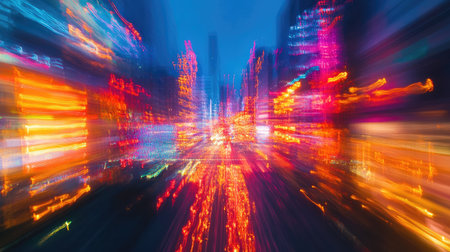 Dynamic abstract light trails over a cityscape, combining vibrant neon colors and blurred urban lights for a futuristic effect.