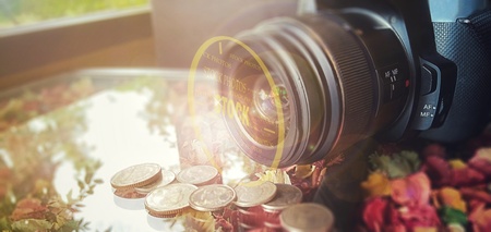 make money with stock photos concept, camera lie on the colorful table with coins in front of the camera lens, add an effect of circle line and stock photos text on it