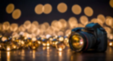 Defocused photo camera with bokeh lights. Abstract blurred background.