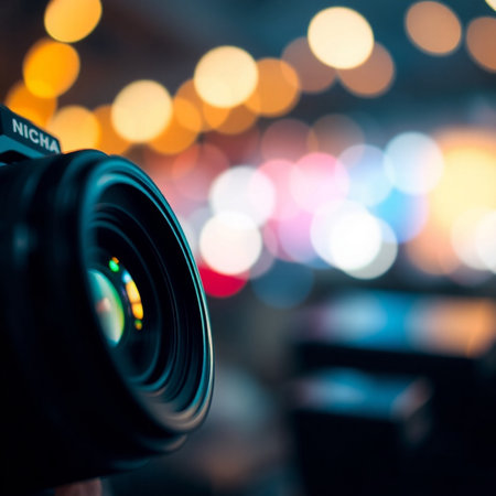 Close-up of a camera lens reflecting vibrant bokeh light effects