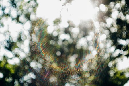 Beautiful Nature Blurred Background. Green Bokeh. Summer or spring backdrop with fresh green leaves and sun flares
