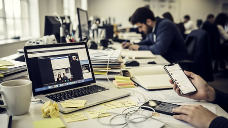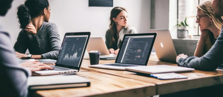 A business meeting focused on customer retention strategies, with laptops displaying various digital marketing tools. . --ar 16:7 --v 6.1 Job ID: 6e47f096-cfc4-48e8-87b1-79c43890d404