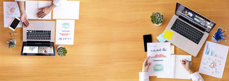 Top view Businessman and businesswoman analysis financial chart with videoconference online meeting. Hand of businesswomen using laptop meeting with diverse colleagues. Covid-19 working from home. With copy space banner