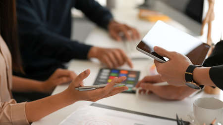 Cropped image, Architect group having the meeting in the office, discussing the construction plan.