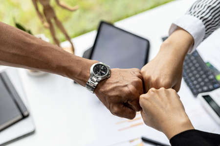Business partners giving fist bump after complete a deal, close up