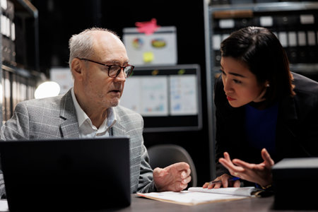 Administrative management coworking businessmen discussing accountancy market database information. Invoicing paperwork in archival cabinet room office filled with document folders and flowcharts