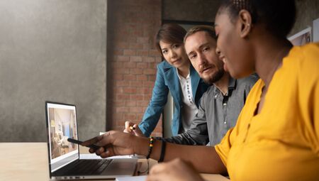 Multi Ethnic Architect and interior designers discussing for a new project ideas with digital tablet computer in a Meeting room. Communication Teamwork Concept.
