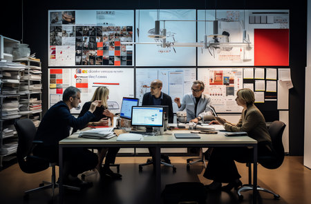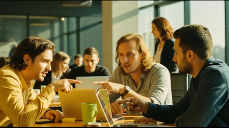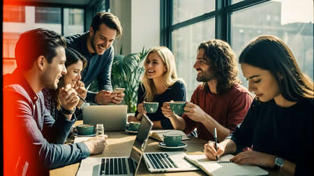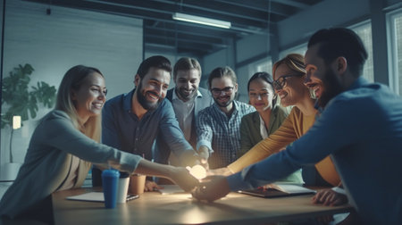 Unity is a key to success Group of young business people working and communicating together while sitting at the office desk with colleagues sitting in the background : Generative AI