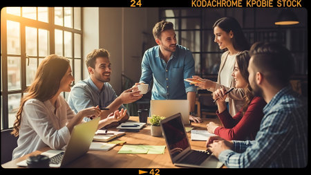 A team leader guides a group of people sitting around a table, each focused on their laptops, A determined leader leading a team meeting with enthusiasm and authority